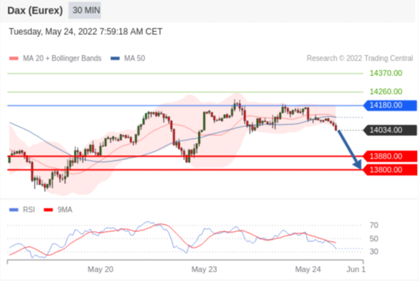 交易策略: 在 14180.00 之下,看跌,目标价位为 13880.00 ,然后为 13800.00 。