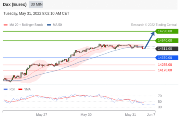 交易策略: 在 14370.00 之上,看涨,目标价位为 14640.00 ,然后为 14790.00 。