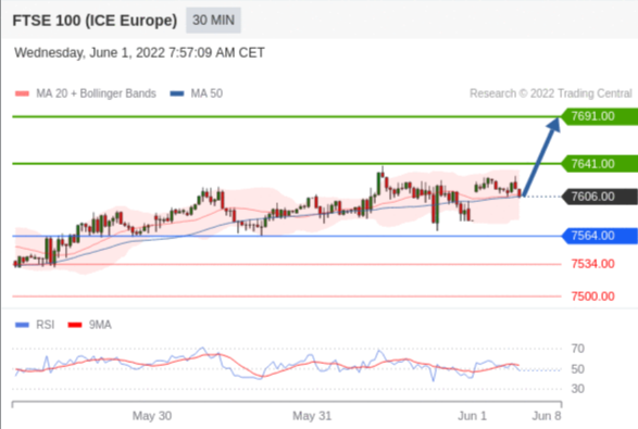 在 7564.00 之上,看涨,目标价位为 7641.00 ,然后为 7691.00 。