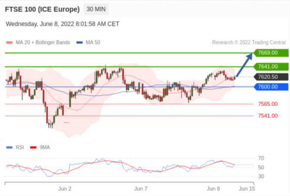 交易策略: 在 7600.00 之上,看涨,目标价位为 7641.00 ,然后为 7669.00 。