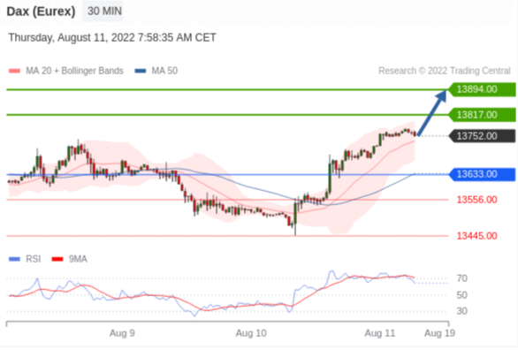 交易策略: 在 13633.00 之上,看涨,目标价位为 13817.00 ,然后为 13894.00 。