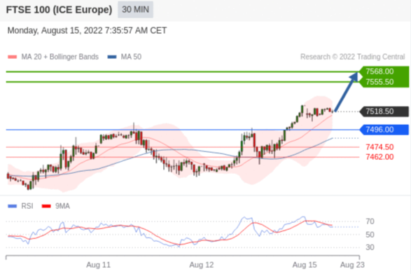 交易策略: 在 7496.00 之上,看涨,目标价位为 7555.50 ,然后为 7568.00 。