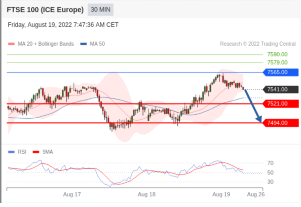 交易策略: 在 7565.00 之下,看跌,目标价位为 7521.00 ,然后为 7494.00 。