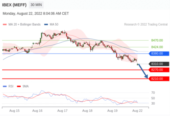 交易策略: 在 8380.00 之下,看跌,目标价位为 8270.00 ,然后为 8210.00 。