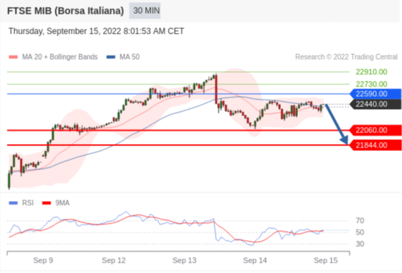 交易策略: 在 22590.00 之下,看跌,目标价位为 22060.00 ,然后为 21844.00 。