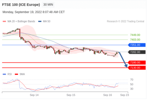 交易策略: 在 7351.00 之下,看跌,目标价位为 7180.00 ,然后为 7130.00 。