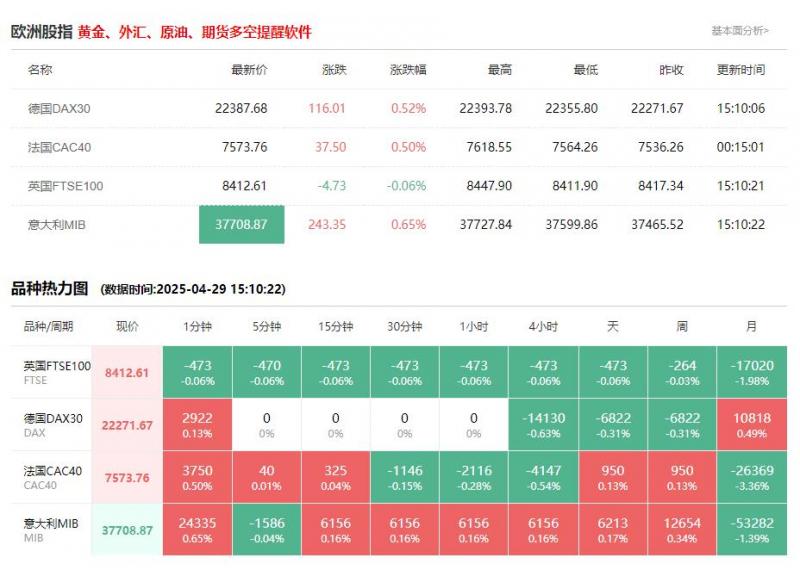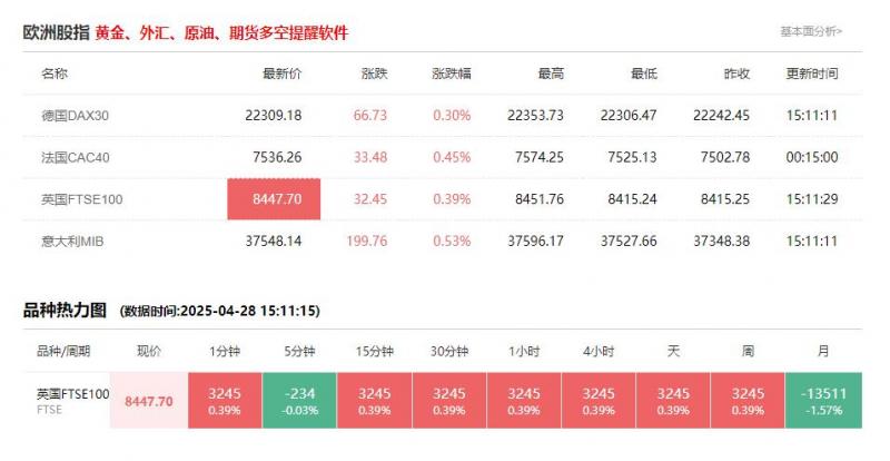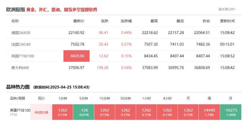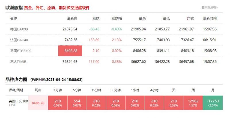股市开盘: 德国DAX30指数4月25日(周五)开盘上涨110.85点,涨幅0.50%,报22180.22点; 英国富时100指数4月25日(周五)开盘上涨25.33点,涨幅0.30%,报8432.77点; 法国CAC40指数4月25日(周五)开盘上涨65.78点,涨幅0.88%,报7568.56点; 欧洲斯托克50指数4月25日(周五)开盘上涨39.47