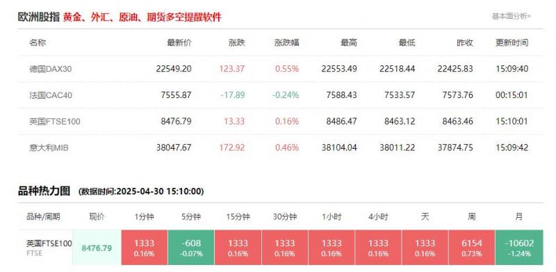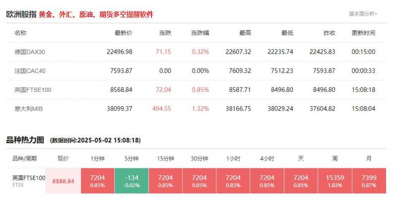 股市开盘: 德国DAX30指数5月2日(周五)开盘上涨310.37点,涨幅1.38%,报22807.35点; 英国富时100指数5月2日(周五)开盘上涨65.10点,涨幅0.77%,报8561.90点; 欧洲斯托克50指数5月2日(周五)开盘上涨62.13点,涨幅1.20%,报5222.35点; 西班牙IBX35指数5月2日(周五)开盘上涨153.20