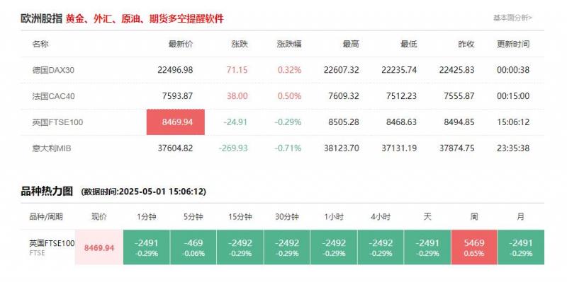 股市开盘: 欧洲斯托克50指数开盘下跌0.36% 法国CAC40指数下跌0.38% 德国DAX30指数上涨0.11% 英国股市休市 今日重点关注的财经数据与事件:2025年5月5日周一 14:30瑞士4月CI月率 16:30欧元区5月ntix投资者信心指数 21:45美国4月标普全球服务业I终值 22: