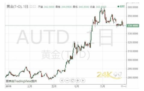 周三(10月30日)亚市早盘,国际现货黄金位于1488.90美元/盎司水平交投。上一交易日金价大幅震荡下行,连续第2个交易日收跌,最低触及1483.46美元/盎司,目前暂于低位略上方窄幅整理交投。 本交易日亚市早盘,上海黄金交易所黄金T+D略微下跌0.17%至339.48元/克。本交易日开盘时报339.28元/克。 (黄金T+D日线