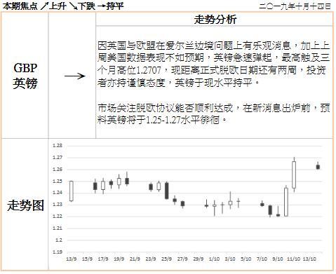 外汇评论 英镑兑美元在憧憬脱欧下升至1.27 英镑兑美元连续第二日显着上升,英国首相约翰逊的脱欧协议获得欧盟领导层支持,并且进入“密集谈判”阶段。我们预计谈判将会十分困难,而任何的协议仍需要多方批准-包括北爱尔兰及英国国会。英国脱欧仍可能需要延期,但能够达成脱欧协议的机会上升(包括延至2020年底的过