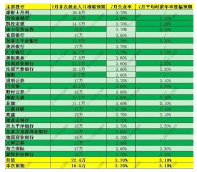 北京时间周五(8月2日)20:30将公布美国7月季调后非农就业人口变动和失业率。以下为摩根士丹利在内26家大型投对本次非农等关键数据的预期。 这26家大型投行预测显示,相对于6月非农就业人口增加22.4万而言,各投行预计7月非农就业人口增幅小幅回落。具体来看,美国7月季调后非农就业人口增幅料介于14.5万-21.2万,失业