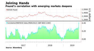 据彭博社报道,英镑汇率的波动如今正越来越像那些新兴市场货币。 随着无协议退欧概率的上升,英镑在刚刚过去的7月录得了自2016年10月以来的最大月度跌幅,而其与新兴货币的90天相关性也已升至近三年来的最高水平。 鉴于美元持续走强,以及英国和新兴市场都容易受到政治风险的影响,这种关系在未来几周可能会受