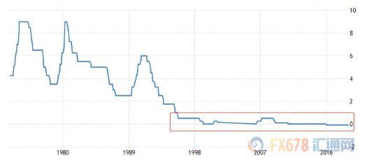北京时间1月23日10:59公布的日本1月央行政策利率现值为-0.1%,预期值-0.1%,前值-0.1%,一如预期的维持不变。日本超低的利率,逻辑上应当对日元造成贬值压力,但由于在低利率环境下,国际游资将日元看做低成本融资货币,这反而提振了日元的需求。日元升值代表全球经济步入下行周期。 下图是日本基准利率走势图: