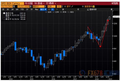 2018年贵金属普遍表现欠佳,现货黄金年度微跌1.57%,现货白银年度下跌8.46%,现货铂金下跌14.51%,部分原因是受到了国际贸易局势的拖累,但现货钯金却依然延续前两年的涨势,屡次刷新历史最高价格,年度上涨19.28%,收报1265.50美元/盎司,成为2018年表现最好的贵金属! 而且现货钯金在12月份多次超过现货黄金的价格