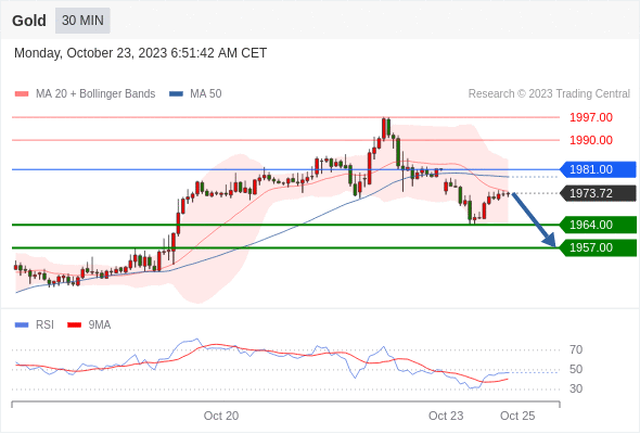 银价(XAG/UD)从23.70美元附近的月度高点回落,因为纽约时段10年期美国国债收益率升至5%。在数据疲软的情况下,白银价格跌至23.00美元附近。长期美债收益率升至2007年以来的新高,因市场预期美联储将在更长时期内维持较高利率。 中东紧张局势升级,a500指数开盘看跌。伊朗干预以巴冲突将扩大中东紧张局势。美
