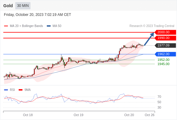 由于中东紧张局势不断升级,美联储(FD)主席鲍威尔在周四的讲话中支持稳定的利率政策,导致金价(黄金/美元)大幅上涨。由于以色列军队准备进入加沙地带,目的是摧毁巴勒斯坦军事组织哈马斯,因此对金银的需求增加。与此同时,尽管美国总统乔-拜登承诺向加沙平民提供人道主义援助,但伊朗可能会介入并直接干预冲突,这