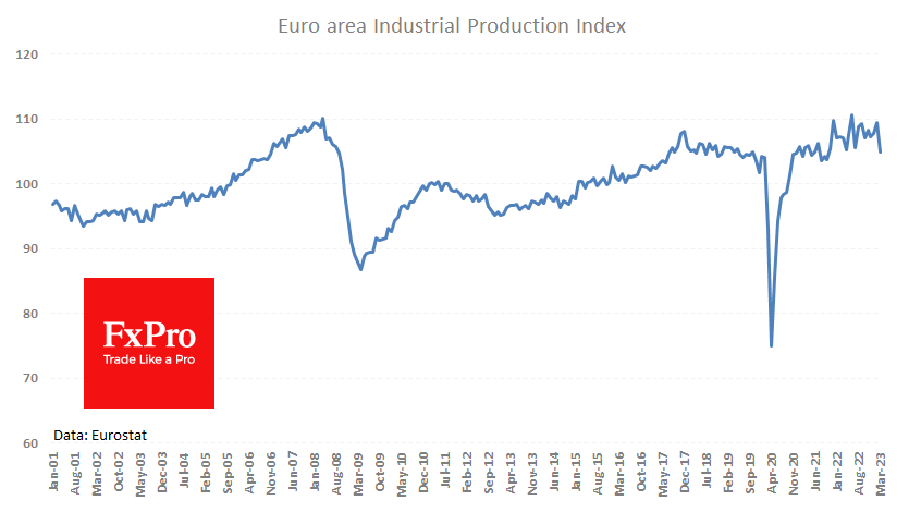 今天,欧盟统计局在报告中指出,欧元区3月份工业生产下降4.1%,为去年7月以来的最大降幅。与去年同月相比,产出下降了1.4%,而不是预期的+0.9%,而2月份则增长+2.0%。 Fxro高级分析师AlxKutikvich指出:经季节性调整的工业生产指数跌至2021年10月以来的最低水平,未能坚持稳定的增长路径,并扭转了自2008年以来
