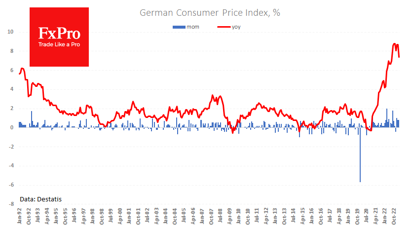 对德国的初步估计显示,3月份消费者价格指数环比增长0.8%,同比增长7.4%,高于平均预期的环比增长0.7%和同比增长7.3%。去年3月,价格一度上涨了2%,为比较创造了一个较高的基数,这导致了同比增长率的放缓。 Fxro高级分析师AlxKutikvich指出:庆祝欧元区战胜通胀为时过早。德国月度物价增长仍与欧洲央行2%的年度