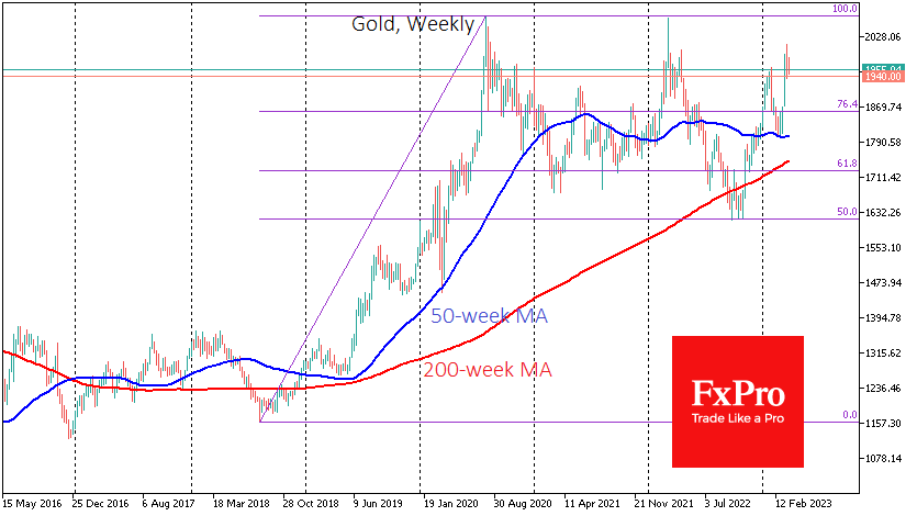 金价上周两次突破2000美元,但两次尝试都未能巩固在这一轮重要水平之上。自上周以来的两次修正为上涨扫清了道路,但并不意味着黄金陷入了困境。 Fxro高级分析师AlxKutikvich指出:黄金从8日低点反弹的势头推动金价在峰值时上涨了200多美元,形成了短期超买的局面。上周,金价短暂触及1940美元下方,过快且冲动,