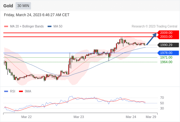 金价在周四保持强势基调并进一步上涨,延续周三美联储决议后1.5%的涨势。 美联储决策者转鸽引发美元下跌,推升金价,而围绕银行业危机的不确定性加剧及其负面影响的的预估,进一步提振黄金的避险吸引力。 周三金价强势反弹使得价格在1935/$1934美元形成双底,略高于重要支撑位1933美元(1809/2009美元升势的38.2%