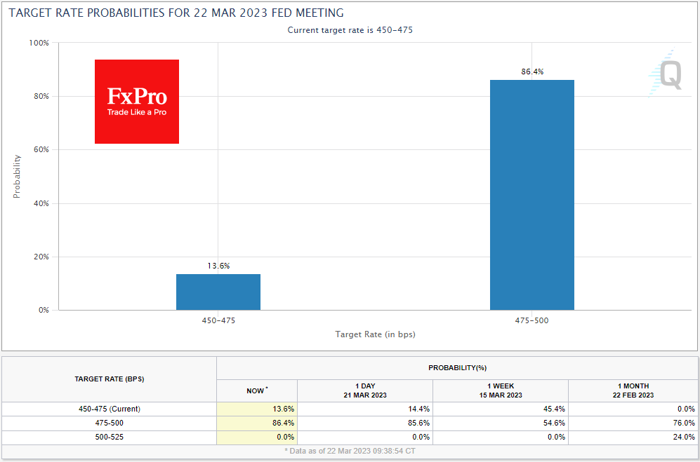 今天,美联储正处在一个两难的境地,它将做出艰难的政策选择。联邦公开市场委员会将不得不在支持金融体系和对抗通胀之间做出选择。他们可以两者兼顾,但结果都是平庸的。 Fxro高级分析师AlxKutikvich指出: 经济学家和市场的预期是加息25个基点(概率约为86%)。但更重要的是,这是否会是本轮加息周期中的最后