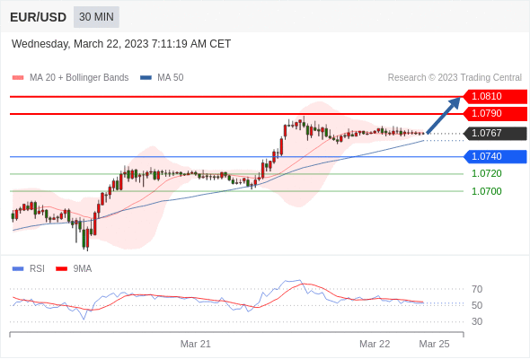 欧元/美元延续上行倾向,触及1.0800的阻力位。 若收盘于后者上方,可能会进一步上行。 周三,欧元/美元上涨至1.0800关口附近的多周新高。 强劲上升趋势的持续可能会很快重新测试周内高点1.0804(2月14日),只要在2023年峰值1.1032(2月2日)之前有效突破这一水平就可能会面临下一个阻力。 从更长期来看,只要高
