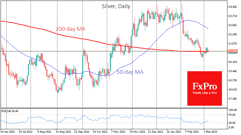 在过去的六个交易日中,每盎司白银的双向交易一直在21美元上方。2月份的大部分时间里,价格一直在下跌,从高点(24.62美元)跌至低点(20.41美元),跌幅超过17%。 Fxro高级分析师AlxKutikvich指出:上个月的抛售使价格回到200日移动平均线,并创造了中期超卖条件,短期内有望为正值,创造了重返24.0美元的机会