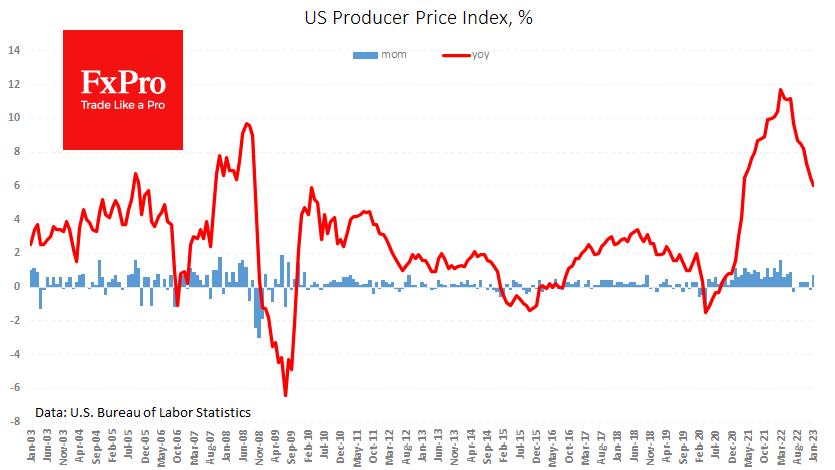 继消费者价格指数之后,美国生产者价格指数带来了另一个鹰派惊喜。1月份I上涨0.7%,明显强于预期的+0.4%。全年物价增长率从6.5%放缓至6.0%,低于预期的5.4%。 Fxro高级分析师Alx?Kutikvich指出:年度通胀率的放缓不值得重视,因为这是由于前一年的高基数效应,而月度增幅仍高于历史平均水平。 生产者价