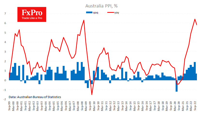 澳大利亚通胀仍然是外汇市场的一个重要话题,因为它试图决定央行下一步的货币政策。与本周早些时候公布的消费者通胀数据形成鲜明对比的是,生产者价格指数增长疲软令人惊讶。上季度增长0.7%(预期为1.7%),年率从6.4%放缓至5.8%。 Fxro高级分析师AlxKutikvich指出:随着生产者通胀超过消费者通胀,预计下一季度