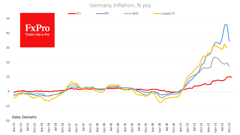 根据公布的Dtati初步估计,德国的消费价格指数在11月下降了0.5%,同比增长放缓至10.0%。这一降幅超过了0.2%的预期降幅,保持了同比10.4%的水平。 Fxro高级分析师Alx?Kutikvich指出:我们之前曾指出,10月份的数据是欧元区通胀的峰值。来自德国的最新数据加强了这一假设。然而,这一逆转将使人们更多地关注欧