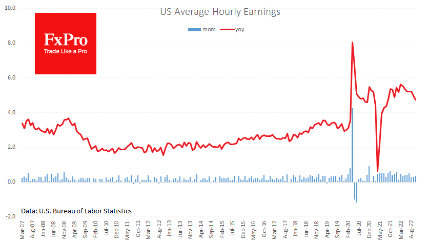 根据L的最新报告,10月份美国经济创造了26.1万个新就业岗位。这些数字超过了预期的20万。此外,上个月的估计从28.8万显著提高到31.5万。因此,劳动力市场继续以高于每月20万个趋势的速度创造就业机会。 Fxro高级分析师Alx?Kutikvich指出:平均每小时收入增长0.4%/,而同比增幅从5.0%放缓至4.7%。这种减速在