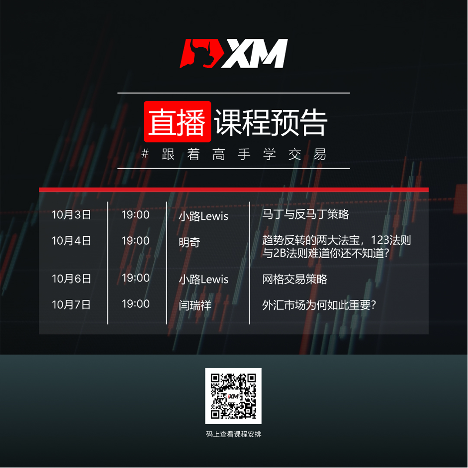 喜迎华诞,欢度十一,祝大家假期愉快! 10月3日(下周一),北京时间19:00,LwiHuag将为您带来经典的马丁与反马丁策略详解。 ·马丁格尔策略介绍 ·反马丁格尔策略介绍 ·策略实务交易缺陷 ·改善马丁的几种方案 扫描下方海报二维码,即刻报名在线讲座!
