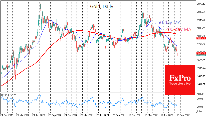 市场对美国通胀数据的强烈反应,挫败了黄金从两年多区间低端反弹的尝试。上周五,金价暴跌至1660美元,刷新了2020年4月以来的低点,而在触及1680美元区域后的19个月里,买盘一直在上升。 值得注意的是,上个月金价从1800美元的水平大幅回落,该水平在2月至6月期间曾多次充当支撑。因此,黄金多头是一个接一个的,释放