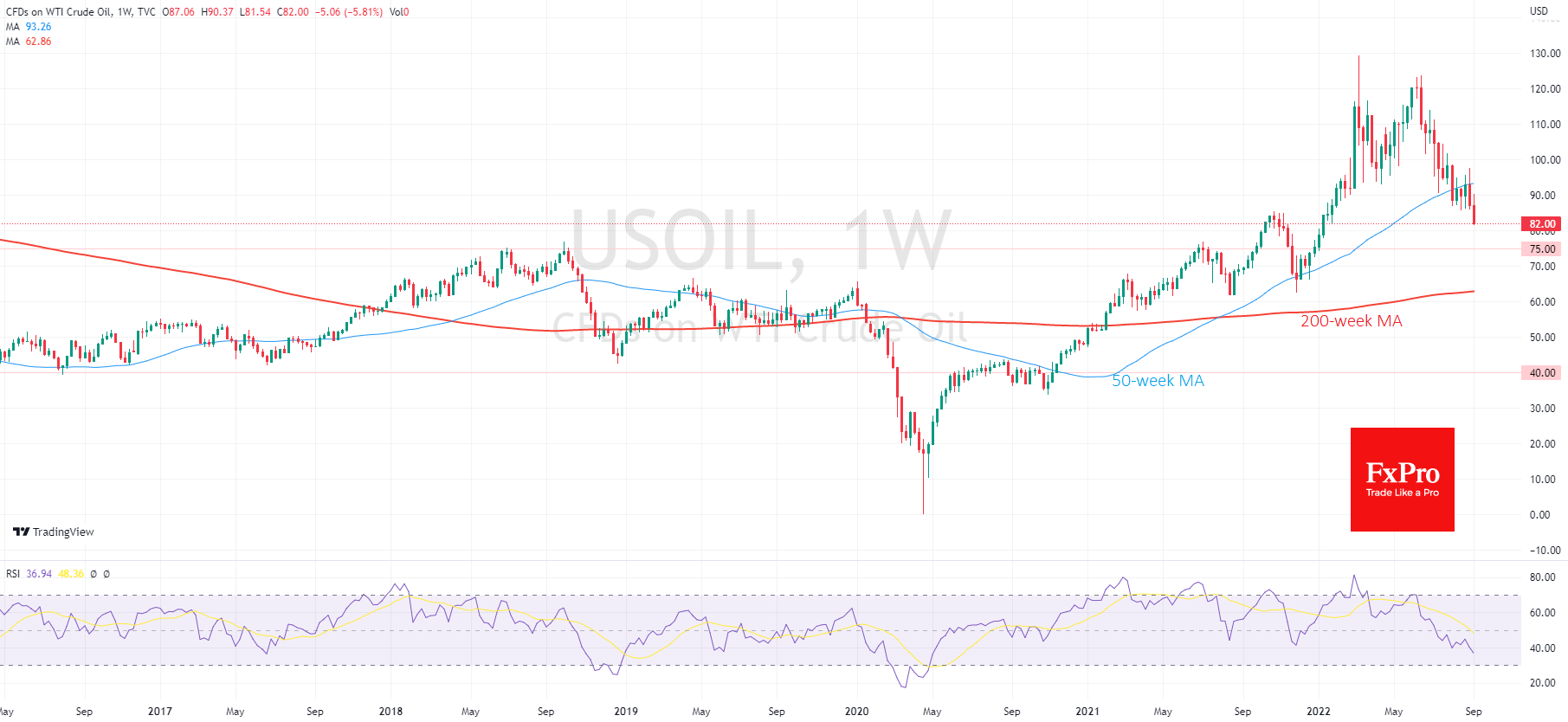 油价周三突破一条主要支撑线,跌至1月份以来的最低水平。盘中跌幅超过6%,进一步凸显了突破的意义。 去年10月,油价跌至上一轮势头的高点以下。市场多头上个月一直在建立的基础无法承受经济放缓导致需求下降和美元升值。 Fxro高级分析师Alx?Kutikvich指出:在周线图上,你可以看到在九月的头几天,即上周的烛