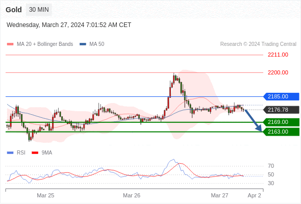周二欧洲时段,金价(XAU/UD)跳升至两日高点2190美元附近,因美元出现修正。美元面临下行压力,因为美联储(Fd)决策者似乎对缓解物价压力越来越有信心,尽管1月和2月通胀数据偏高,但他们预计今年将降息三次。 投资者期待有关通胀前景的新线索,以了解美联储何时开始降息。市场参与者将密切关注本周五公布的美国2