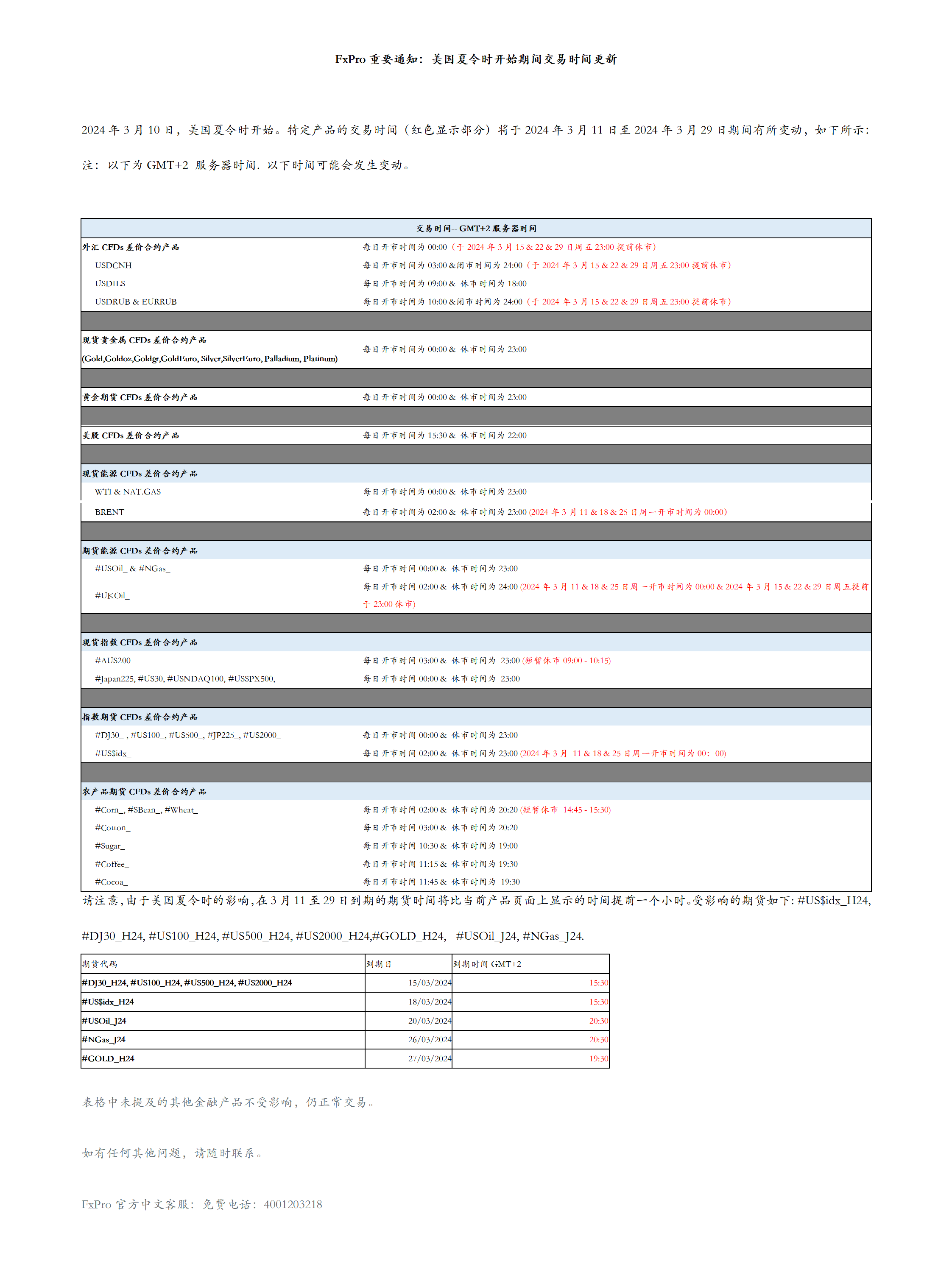 2024年3月10日,美国夏令时开始。特定产品的交易时间(红色显示部分)将于2024年3月11日至2024年3月29日期间有所变动,如下所示: 注:以下为GT+2服务器时间.以下时间可能会发生变动。 交易时间--GT+2服务器时间 外汇CFD差价合约产