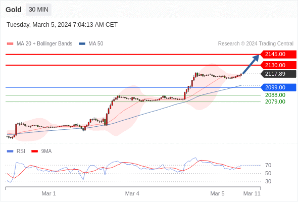 金价(XAU/UD)周二连续第五个交易日上涨。贵金属刷新三个月高点,逼近2023年12月创下的约2,145美元历史高点。黄金的上涨是在谨慎的市场情绪和对美联储(FD)将在6月政策会议上降息的押注增加的情况下发生的。 投资者正在等待美联储主席杰罗姆-鲍威尔(Jroowll)周三在国会的证词,以及将于周三公布的一系列美