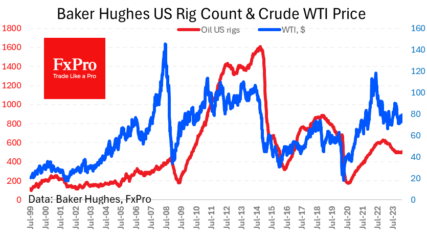 油价在周五收盘上涨近2%,达到3.4%的峰值后,周一修正了0.2%。WTI触及80.3美元的高位,上一次出现在2023年11月,若在79美元上方盘整,将意味着突破长期水平阻力位,这是多头在过去四个月未能突破的位置。 Fxro高级分析师AlxKutikvich指出:上周五的涨势使美元与200日移动均线之间的差距增大,这也应被视为看涨力