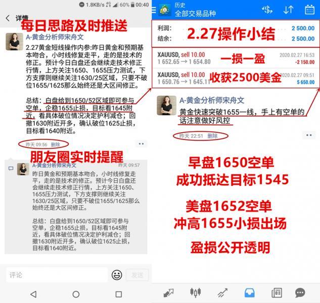 稳打稳扎,数据行情不贪多,日盈十个点安稳落袋:今天的行情主要波动还是在美盘,亚盘一直横盘,在欧盘开始探高触及1648一线,舟文尝试性的安排了一单空单,后行情回撤力度不大,鉴于空单又是逆势单,给到小盈机会及时安排出常美盘开盘前黄金继续探高,并有企稳1650的势头,舟文果断安排多单进场,成功收获7个点利润