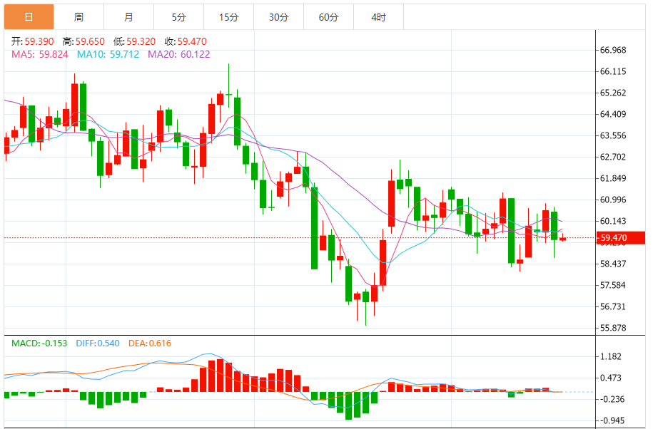 基本消息面 美原油周四小幅震荡,交投于59.45美元/桶附近,短期的下跌反映市场在多重因素作用下出现明显抛压。影响行情的首要因素来自美元指数强势反弹,美元升至两周高点削弱以美元计价的大宗商品吸引力,使多头情绪受到压制。 与此同时,外部局势出现新的缓和信号,市场对能源风险溢价的
