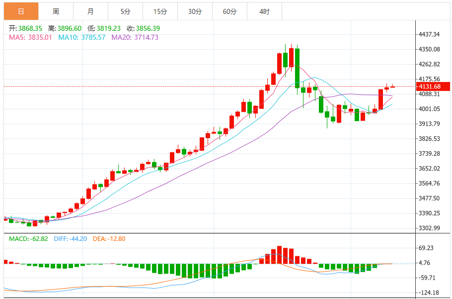 黄金:回调测试支撑,空头动能待释放 当日黄金呈现“高开低走”的弱势格局,伦敦金现从开盘4142.1美元持续回落,午后触及4098.69美元低位后略有反弹,整体处于前期上涨波段的回调过程中,技术面呈现明确的短期调整信号。 1.多周期技术信号 日线级别:价格跌破5日均线(4128美