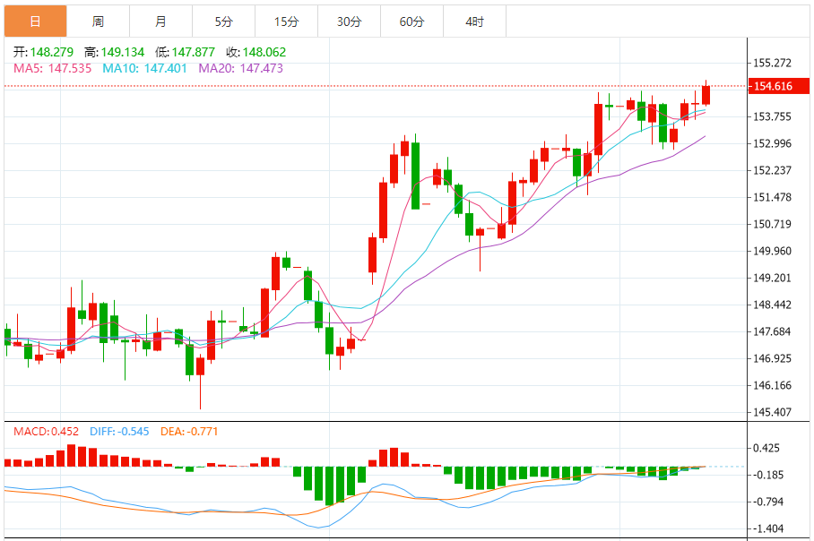 周三(11月12日),美元/日元上涨154.629,暂报154.616,涨幅0.31%。 市场基本面分析 据报道,11月12日,日本新任首相高市早苗表示,她“强烈希望”日本银行(OJ,akofJaa)通过货币政策稳定实现2%的通胀目标,这一通胀应由工资上涨驱动,而非原材料价格上涨。 高市早苗