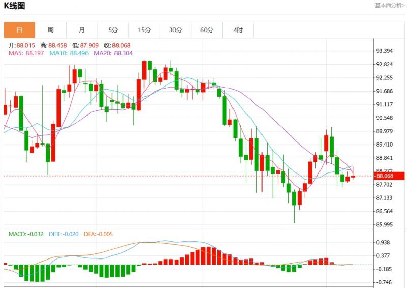 周一盘中,澳元日元报88.096,涨幅0.04%。 今日分析:看跌,当88.46为阻力位。 备选策略:向上突破88.46,将带来继续上行的趋势,目标位定在88.86和89.10。 技术点评:RI技术指标低于50。ACD技术指标呈现看多状态并处在其信号线的下方。此外,价位处在其20天及50天移动平均