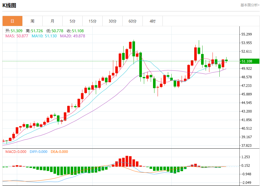 周二盘中,现货白银报51.118,跌幅0.43%。 今日分析:在50.65之上,看涨,目标价位为51.80,然后为52.45。 技术点评:RI技术指标运行趋势复杂,倾向于上涨。 支撑位:50.6550.1049.70 阻力位:53.0552.4551.80 (亚汇网编辑:冰凡)