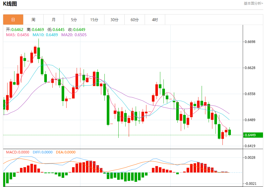 今日周二,澳元兑美元报0.6450,跌幅0.19%;美元兑加元报1.4122,涨幅0.10%;美元兑瑞郎报0.8098,涨幅0.17%。 澳元兑美元汇率分析 技术点评:超短线(当日内)技术指标运行趋势复杂,应谨慎操作。 阻力位:0.65050.64900.6475 支撑位:0.64400.64300.6420