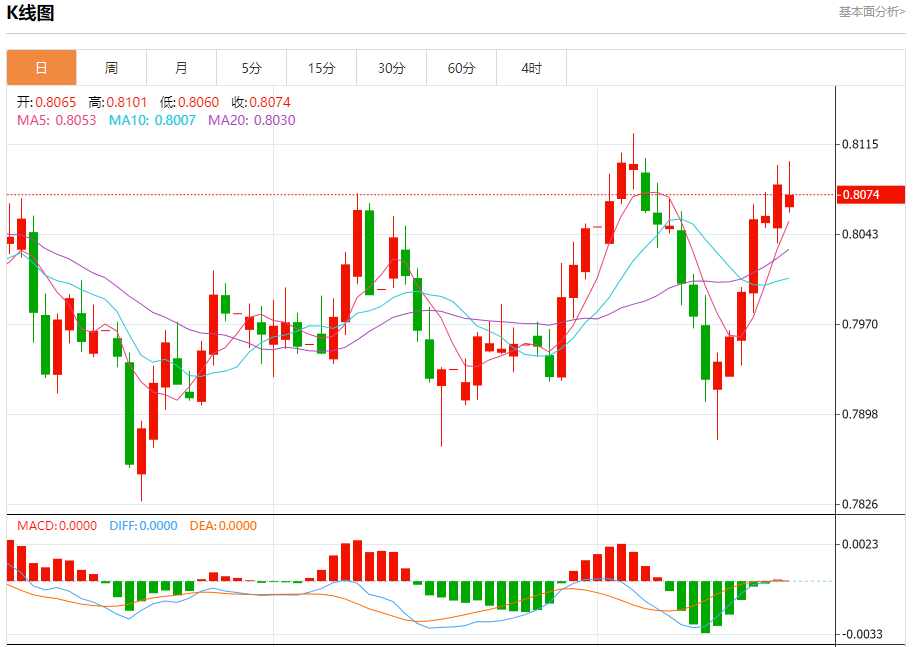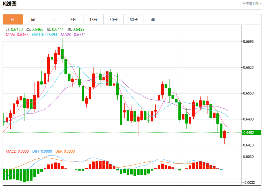 今日周一,澳元兑美元报0.6455,跌幅0.05%;美元兑加元报1.4108,涨幅0.03%;美元兑瑞郎报0.8076,跌幅0.12%。 澳元兑美元汇率分析 技术点评:随后的阻力位是0.6475,然后为0.6500。 阻力位:0.65200.65000.6475 支撑位:0.64400.64200.6400 美元