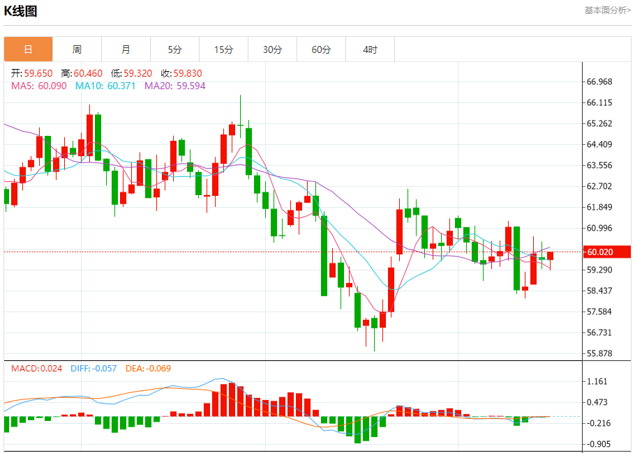 周二盘中,WTI原油报60.00,涨幅0.23%。 今日分析:在60.30之下,看跌,目标价位为59.15,然后为58.70。 技术点评:RI技术指标缺乏动能 支撑位:59.1558.7058.15 阻力位:61.1560.7560.30 (亚汇网编辑:冰凡)
