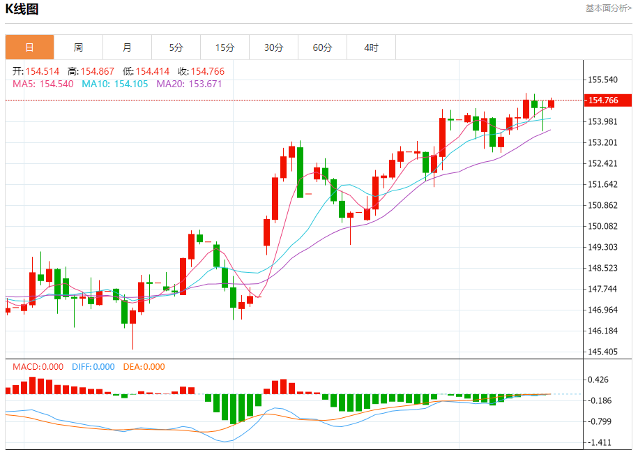周一盘中,美元/日元报154.771,涨幅0.17%。 今日分析:在154.30之上,看涨,目标价位为155.00,然后为155.35。 技术点评:RI技术指标看涨,有进一步向上趋势。 支撑位:154.30154.00153.60 阻力位:155.70155.35155.00 (亚汇网编辑:冰凡)