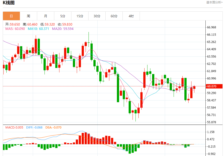 周一盘中,WTI原油报60.060,跌幅0.03%。 今日分析:在59.15之上,看涨,目标价位为60.45,然后为61.15。 技术点评:RI技术指标看涨,有进一步上升空间。 支撑位:59.1558.7058.35 阻力位:61.4561.1560.45 (亚汇网编辑:冰凡)